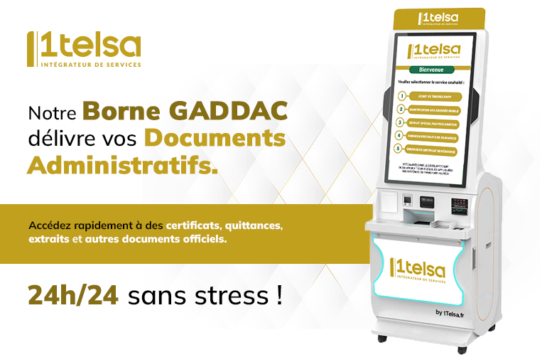 La borne GADDAC est un guichet automatique intelligent développé par 1Telsa, permettant de délivrer instantanément vos documents administratifs sans passage par un guichet classique. Fini les longues files d’attente : accédez à vos documents à tout moment, en toute autonomie.